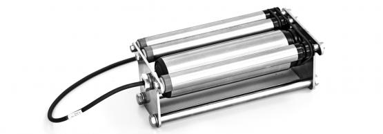 Dient als angetriebenes Übergabeelement zwischen zwei Förderbändern für kleine Beutel mit Lebensmittel. Aufgrund der beengten Platzverhältnisse ist ein kompakter Antrieb erforderlich. Im Fall der Motorrolle direkt im Förderelement, der Tragrolle, integriert.